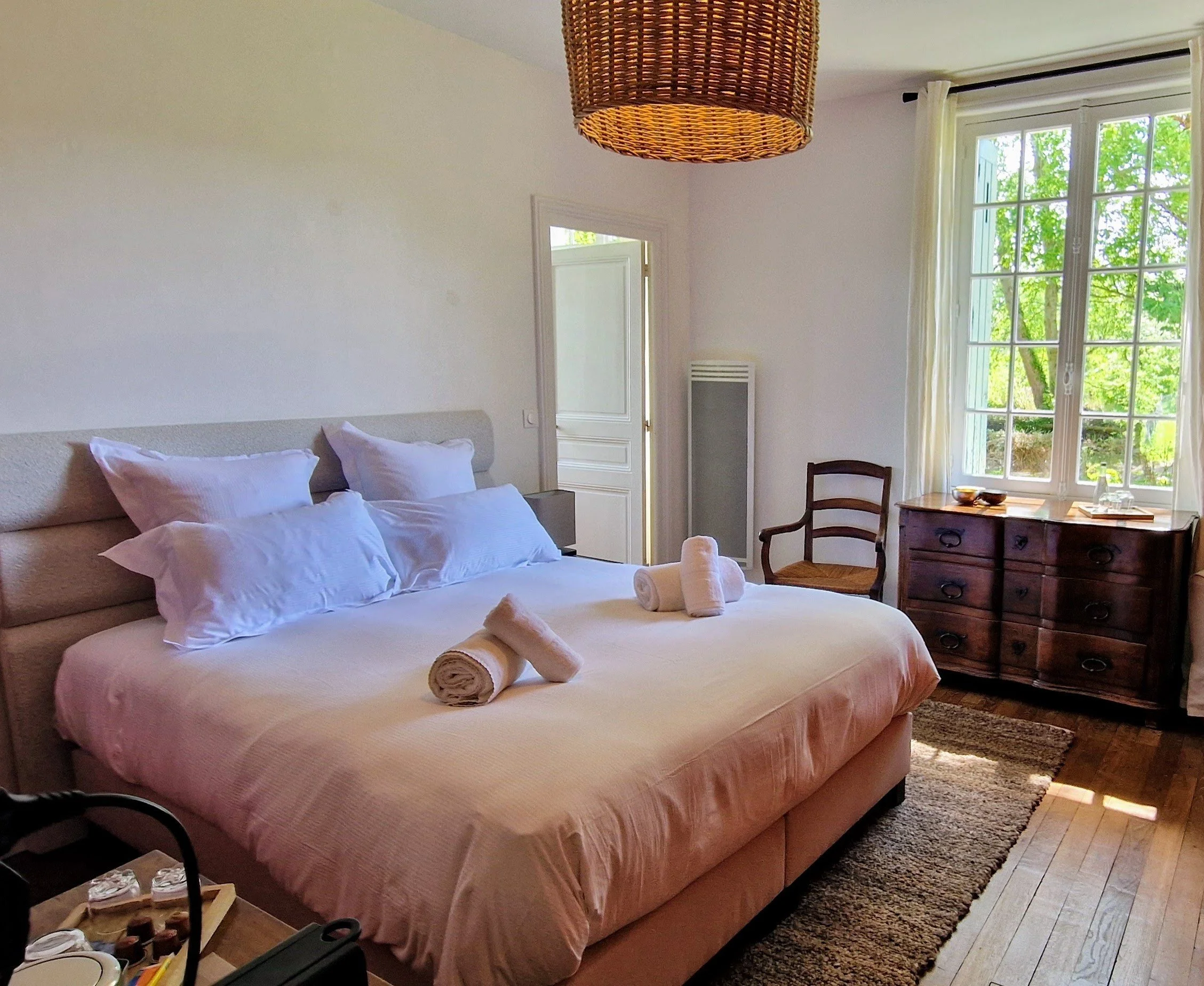 La chambre double, côté séquoia, bénéficie d’un panorama exceptionnel sur l’arbre emblématique du domaine grâce à ses deux grandes fenêtres. Elle dispose de sa propre salle de bain, particulièrement agréable, avec de grandes fenêtres qui laissent entrer la lumière et offrent une belle vue dégagée sur le domaine, même depuis la douche.